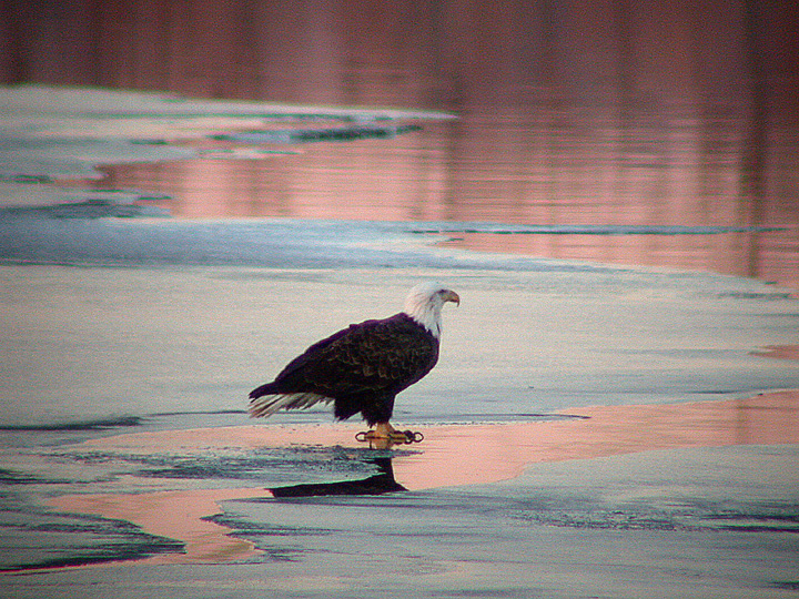 "PINK ICE" RESULTING FROM A JANUARY SUNSET AT REDA (RIVERLANDS ENVIRONMENTAL DEMONSTRATION AREA) NEAR ALTON, ILLINOIS, ACCENTUATES THE TALONS OF THIS BALD EAGLE.